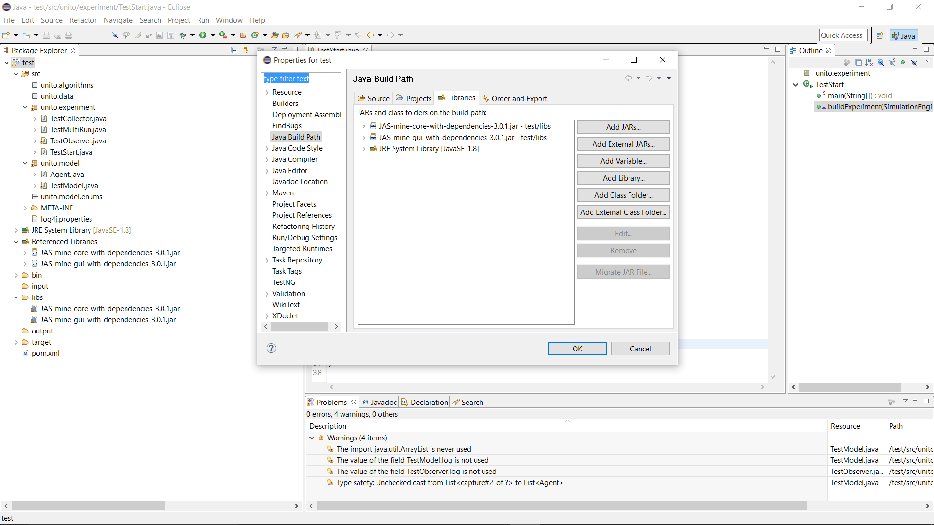 You can check the JAS-mine .jars are on the build path by right-clicking on the project and selecting ‘Build Path / Configure Build Path’. Check the new .jars are there in the Libraries tab. Note that Eclipse should no longer show any Errors in your project related to missing JAS-mine classes. You should see the following: