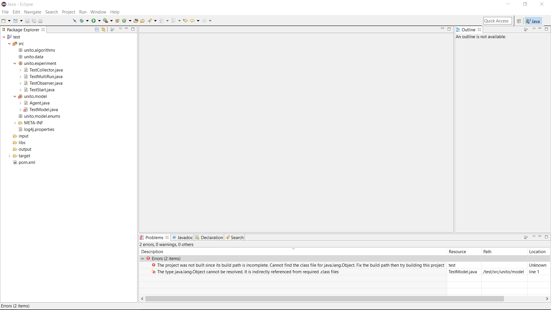 - To run the simulation, assuming your project is named test, click on the arrow next to its name, and open src/main/java -> test.experiment -> testStart.java by double-clicking it. From the top menu, select Run -> Run As -> Java Application. This should open the new window with the interface of the simulation.