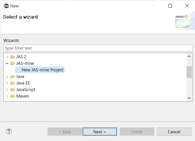 The JAS-mine Eclipse plugin makes it very simple to create new JAS-mine projects from scratch. Read on to learn how to get started and use the JAS-mine Eclipse plugin.