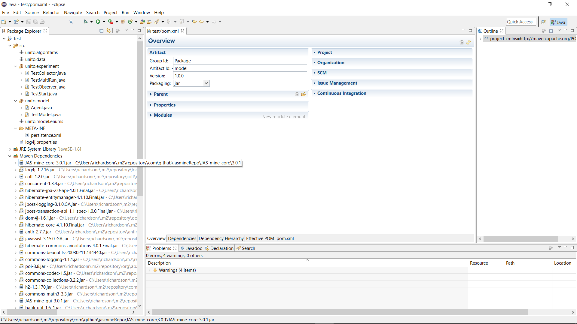 The easiest way to install the JAS-mine libraries is to use Maven, which now comes pre-installed in Eclipse IDE. Maven allows you to specify all the dependencies for your project (these might include other libraries in addition to JAS-mine) in a POM (Project Object Model) xml file. When a new JAS-mine project is created in Eclipse, the POM file is automatically included. The POM file specifies the version of the JAS-mine .jars to use, and can be modified within Eclipse.