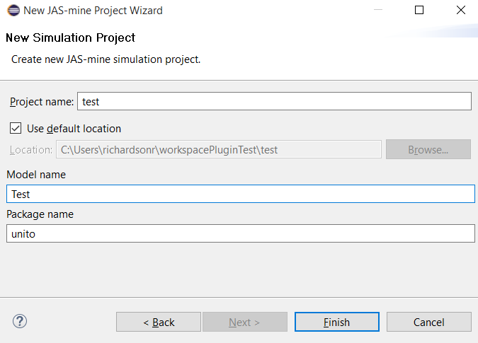 From the list, select ‘JAS-mine/New JAS-mine Project’. The JAS-mine wizard will ask you to enter a project name, a model name, and a package name, and you have the choice of whether to use the default location or specify an alternative. (Note, that a Java Model Exception will be thrown if you try to use ‘package’ for the package name – please choose a different name.) Once you have entered these, you are done.
