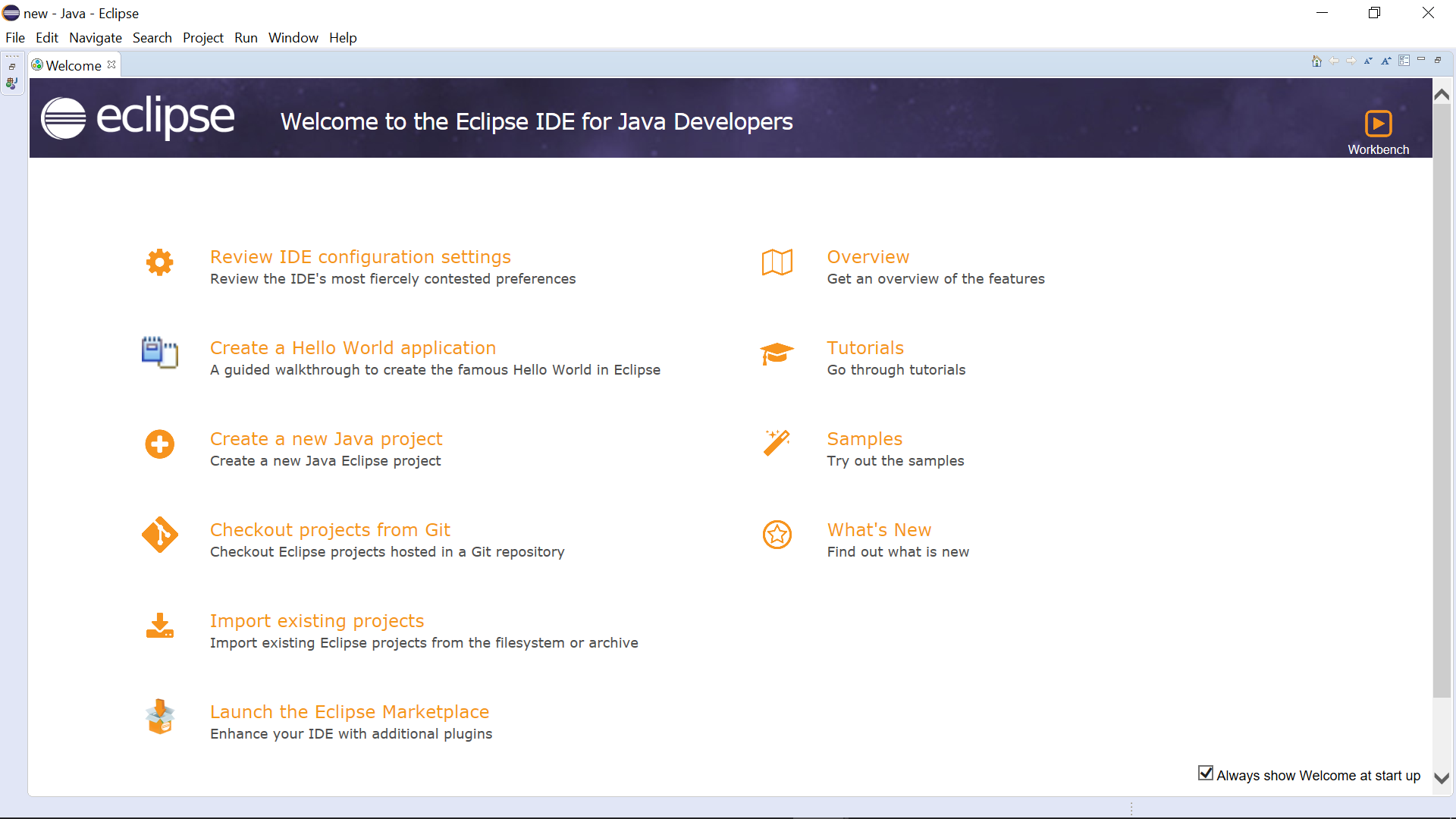Open Eclipse. The first thing you’ll see is the welcome screen: