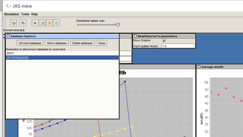 - Click Build Simulation Model (the icon with a cogwheel and a green arrow) and then the bigger green arrow next to it. This should run your first JAS-mine simulation, showing Agents’ wealth and Average wealth over time on the screen.
