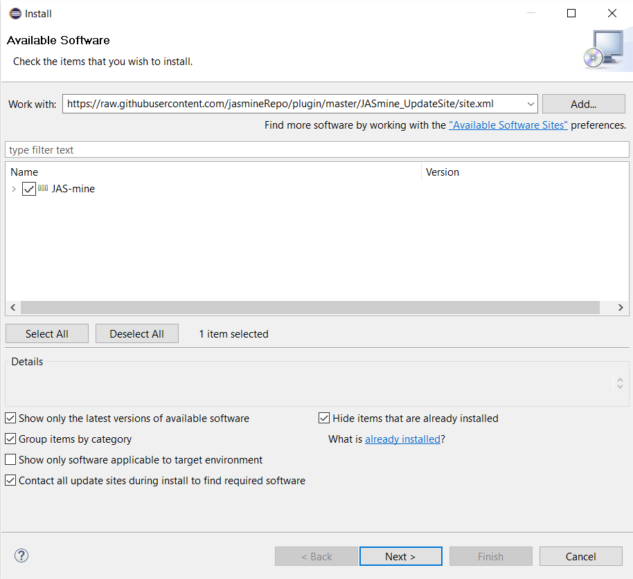 After a few seconds, ‘JAS-mine’ or ‘JAS-mine_Plugin’ should appear in the list. Tick the box next to the JAS-mine option and click the ‘Next’ button on the bottom of the window. Accept the license agreement, and complete the installation. As is common in many Eclipse plugins, you will be prompted with a warning that you are installing unsigned content. Continue without fear by clicking on the ‘OK’ button.