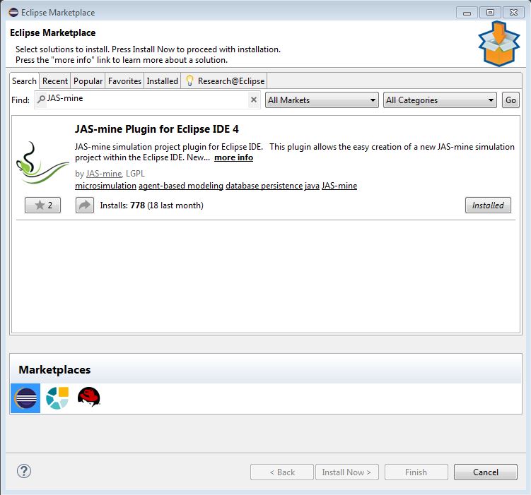 - Open Eclipse, click Help -> Eclipse Marketplace. Type “JAS-mine” in the search box and install JAS-mine Plugin for Eclipse IDE 4.