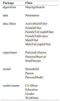 The core of the simulation lies in the model package, which contains the classes PersonModelPerson and Household. The experiment package contains the StartPerson class that specifies to run the simulation in interactive mode, the PersonsCollector class that collects all the statistics needed to monitor the simulation and updates the output database, and the PersonsObserver class that creates and manages the graphical object for runtime monitoring. Parameters and coefficients are loaded into the Parameters class in the data package. All filters used to filter collections are grouped in the data.filters subpackage. The categories used for gender, educational levels, civil state and work state are stored as Enums in the model.enums subpackage. Finally the algorithms package contains classes that perform technical tasks (in the example, MapAgeSearch searches age- and gender- specific values in a map of coefficients, with age and gender as keys). Classes in the algorithms package are meant to be of general use beyond the specific model being developed, and are candidates for inclusion in the core libraries in future releases of JAS-mine.