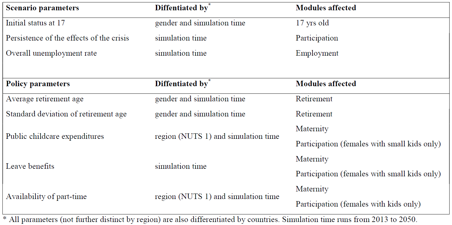 The model has the following scenario and policy parameters: