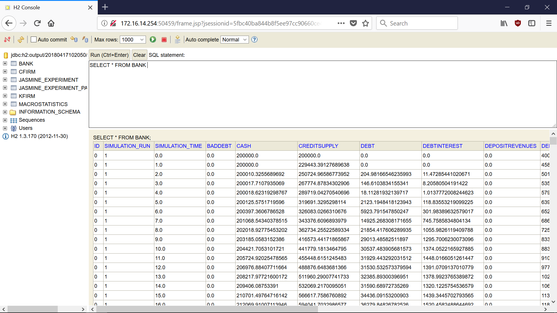 The Tools > ‘Database explorer’ tab in the JAS-mine GUI allows to browse the input and output databases, though in order to create an output database, the ‘Export To Database’ GUI parameter should be enabled (check its tick-box) in the list of ‘MacroCollector’s parameters’ . By selecting a specific database (either the ‘INPUT’ database or the output databases labelled by the timestamp of when the simulation was executed) and pressing the ‘Show database’ button, the data can be explored in the default web browser using SQL commands. As an example, the output tables can be exported in .csv format for subsequent analysis using specific statistical tools by typing:
