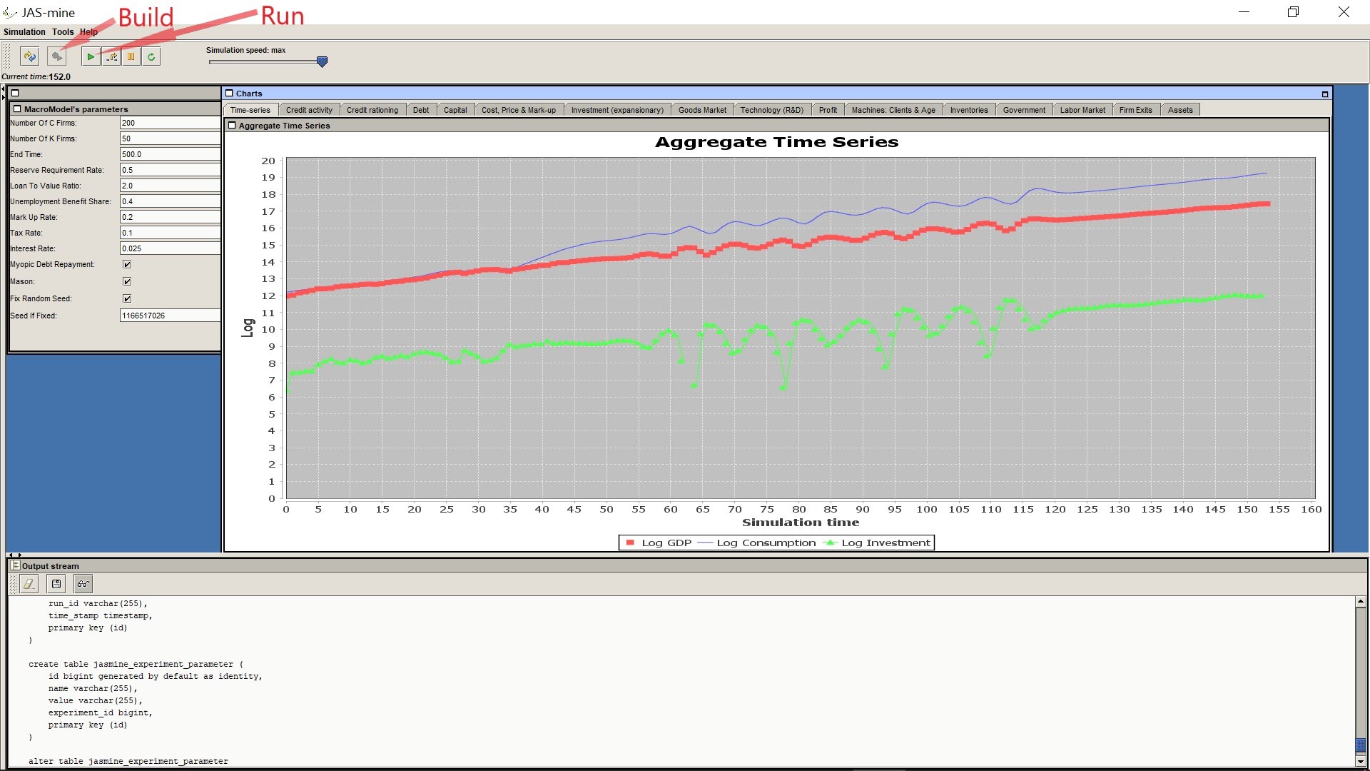 The Start class implements the ExperimentBuilder interface, which defines the buildExperiment() method. This method creates managers and adds them to the JAS-mine engine. In MacroABM, a typical user may start exploring the model by running a simulation in interactive mode (Box 1).