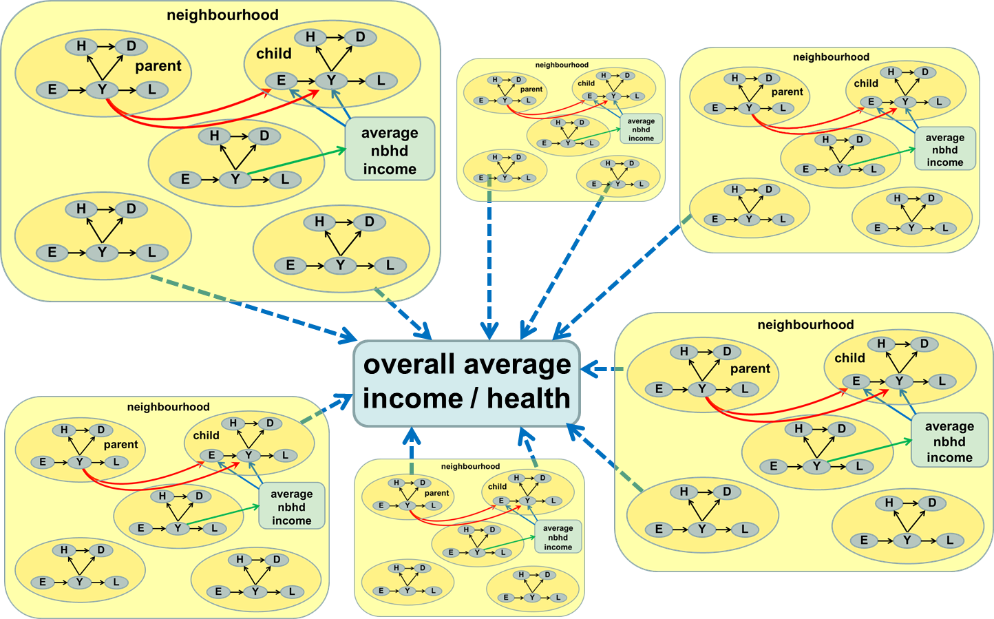 THIM is a computationally heavy model with lots of interactions, however agents also undergo demographic transitions modelled by stochastic processes represented by regressions, so it is ideal in representing a hybrid AB and MS model. The model recreates stylized individual-level relationships among health status, education, income, mortality rates and neighbourhood mobility. There are multiple levels featured in THIM, from individuals and parent-child dyads, to neighbourhoods and cities. The interactions between the states of individuals and across a hierarchy of aggregation levels are represented in the figure below. These levels allow to capture the roles of parental transmission of socio-economic status and health advantage to children, the impact of average neighbourhood income on school, and overall city-wide patterns of inequality and mortality.